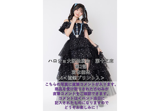 | 備考 Remarks | 料金:2,500円 (A4写真【直筆プリント入】 + トークイベント視聴チケット) ※A4写真は第1部と第2部で異なります。 <販売期間> ・クレジット決済: 2025年12月2日(火)18時~2026年1月30日(金)20時 ・コンビニ決済: 2025年12月2日(火)18時~2026年1月27日(火)24時 (ご注文された日を含め3日以内にお支払いください。) <視聴期間> 2026年1月16日(金)18時~2026年1月30日(金)24時 ※視聴期間になりますと会員ページ「購入商品履歴」からご視聴いただけます。 ※視聴期間は変更になる場合もございます。 ※視聴期間中は繰り返し何度でもご視聴いただけます。 <視聴方法> 1.「HELLO! PROJECT STREAM ONLINE STORE」にログインしてください。ログインするとトップページが表示されます。 2.右上の会員ページ(スマートフォンの場合、右上の「MENU」中のにあります。)を押すと、お客様の会員情報が表示されます。そのままページを下にスクロールすると、購入商品履歴が表示されます。 3.購入商品履歴にて該当の商品を選択すると、注文詳細が表示されます。そのままページを下にスクロールすると、商品画像が表示されます。 画像の再生マークを押すと、動画が開始されます。 <A4写真のお受け取りについて> ・配送にてご自宅でお受け取り→2026年2月下旬発送予定 ・ハロー!プロジェクト オフィシャルショップにてお受け取り(名古屋大須店・大阪店) →店舗受取期間:2026年2月13日(金)~2026年3月13日(金) ※A4写真の受け取りに関してはHELLO! PROJECT STREAMに登録のアドレスに2026年2月12日(木)までにお送りいたします。店舗受取の際には、メールと身分証をレジにてご提示ください。 ※ご購入後はお客様都合によるA4写真の受け取り店舗変更および配送受け取り変更はできません。 |